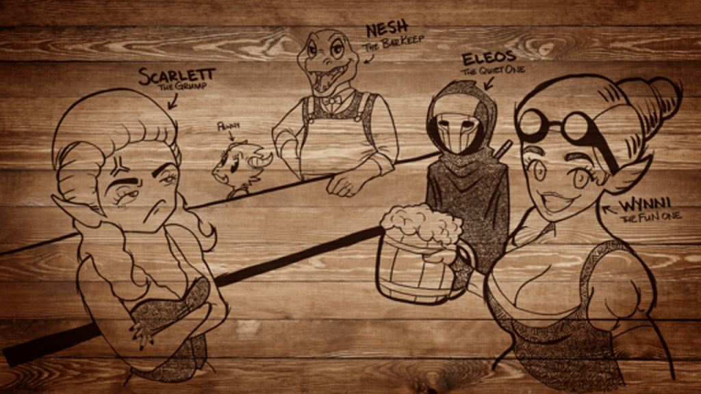 The second of Proximus’s illustrated journal entries on The Innocence, showing his entry into the bar where he comes across Scarlett, Wynni, Eleos, Nesh, and Penny.